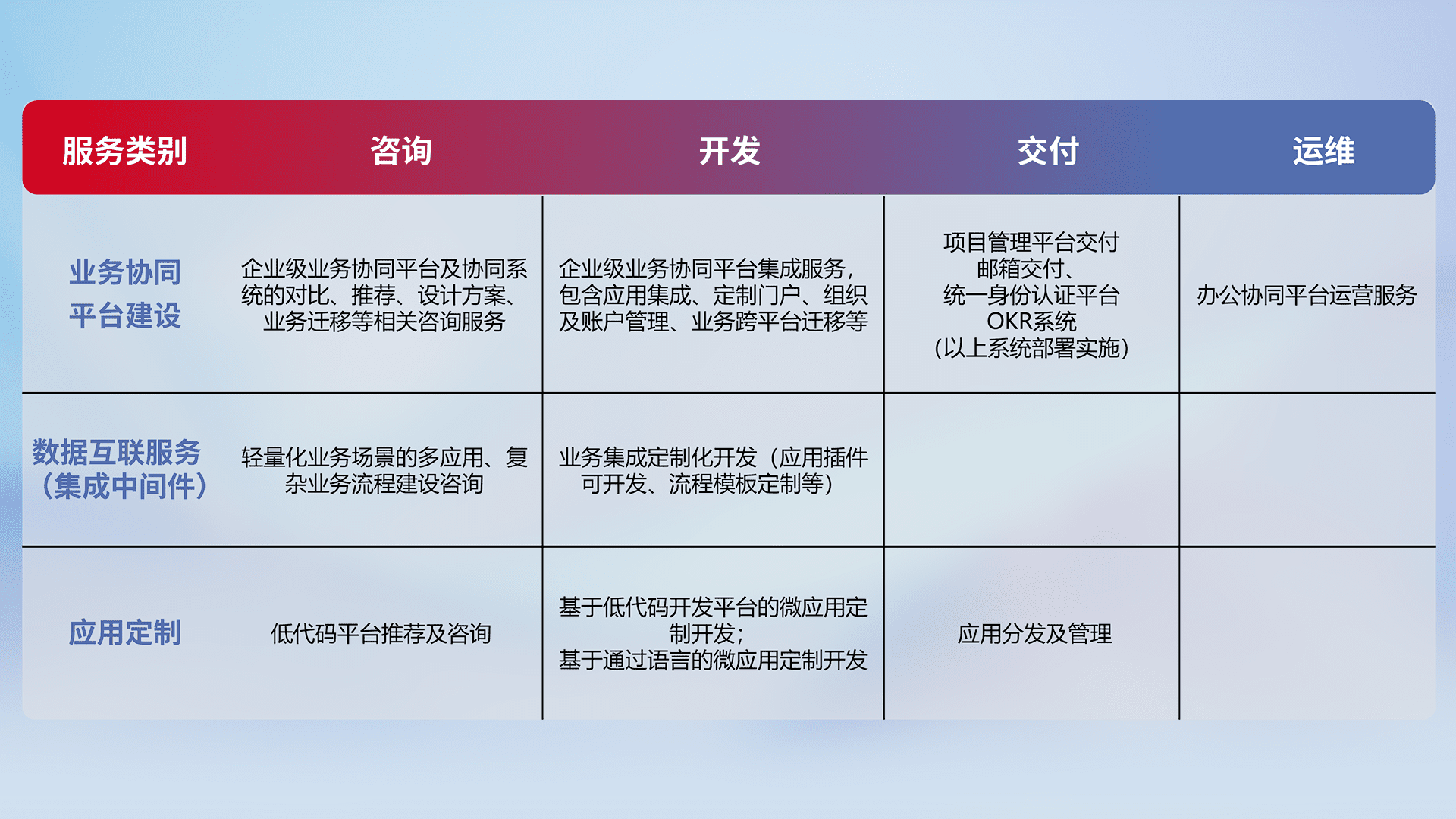 针对钉钉、、、、企微、、、、IDaas等平台级产品提供产品的规划、、方案、、、交付、、定制化开发等服务,,实现如统一协同办公、、、智能客户服务、、、混合会议管理、、、智能数据查询、、、等业务场景,,,,实现数字化转型。。